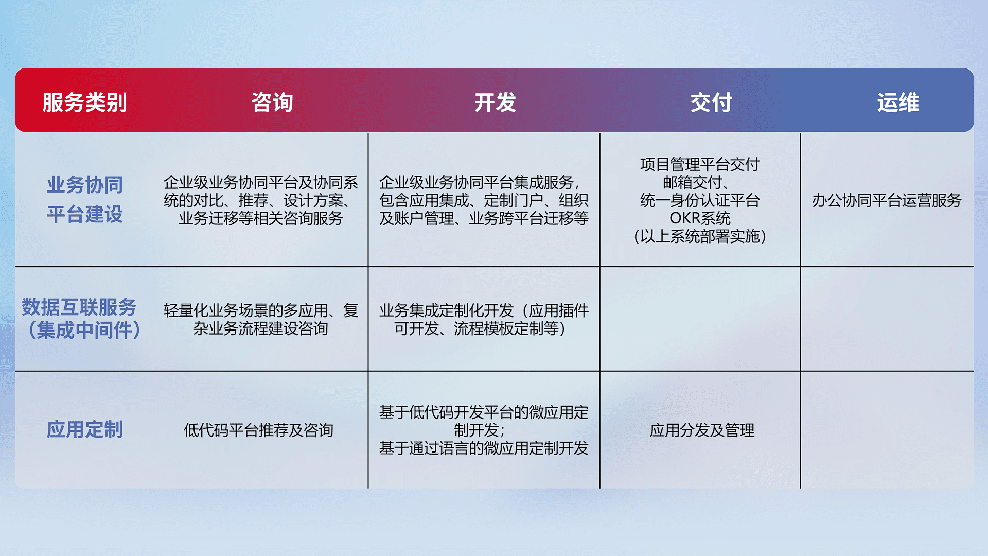 针对钉钉、、、、企微、、IDaas等平台级产品提供产品的规划、、、方案、、、、交付、、定制化开发等服务,,,,实现如统一协同办公、、、智能客户服务、、混合会议管理、、、、智能数据查询、、等业务场景,,,,实现数字化转型。。。。